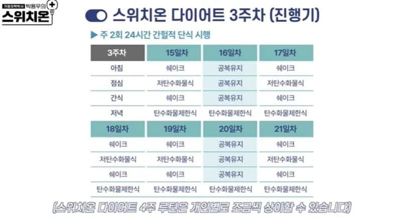 단기간에 체중을 빠르게 줄이고 싶을 때 스위치온 다이어트라는 방법을 접하게 된다. 하지만 실제 효과와 지속 가능성에 대하여는 제대로 알아야 하므로 정리를 해본 후에 시작해보려고 한다.